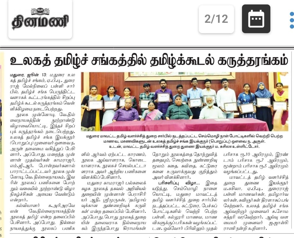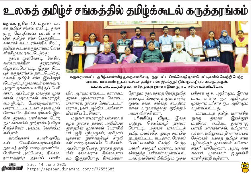 சிறப்புத் தமிழ்க்கூடல் June 14, 2025 by avvai தினமணி https://www.facebook.com/share/v/15mGW7E9hY/?mibextid=oFDknk இன்றைய தினமணி நாளிதழ் செய்தியில் ….